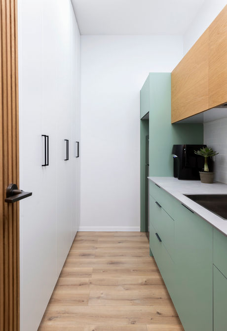 הקיר המתעגל בקצהו שכולו עשוי בנגרות הופך להיות דלת כניסה למטבחון קיר הכוח שעליו הלוגו מצידו השני הוא קיר אחסון מרצפה עד תקרה והוא מכיל את מירב הקלסרים והאיחסון שהמשרד זקוק לו . ממולו המטבחון הנוח והמרווח .